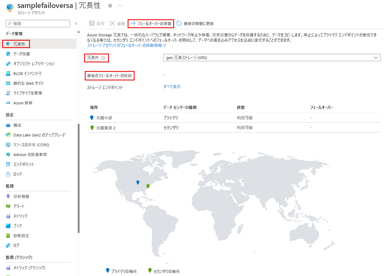 [データ管理] グループ内から [冗長] を選びます。 次の図では、ストレージ アカウントの geo 冗長性の構成とフェールオーバーの状態を示します。
