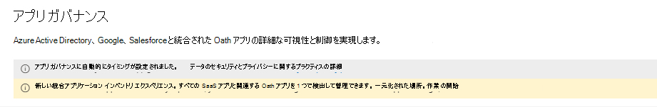 [OAuth アプリ] タブでは、Microsoft 365、Google ワークスペース、Salesforce が表示されます。 管理者は、アプリケーションを確認し、アプリを無効にするか、ポリシーを適用して環境内での動作を監視することを決定できます。