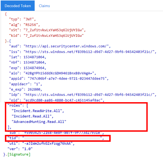次の図では、アプリから取得したデコードされたトークンを、 Incidents.Read.All、 Incidents.ReadWrite.All、 AdvancedHunting.Read.All のアクセス許可で確認できます。