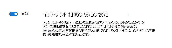 テナント全体の分析ルールによって生成されるアラートとインシデントの既定のインシデント相関動作を設定します。 この設定は、Microsoft Defenderが関連付けエンジンに、インシデントの相関関係の動作を明示的に構成していないすべての分析ルールに含めるかどうかを決定します。
