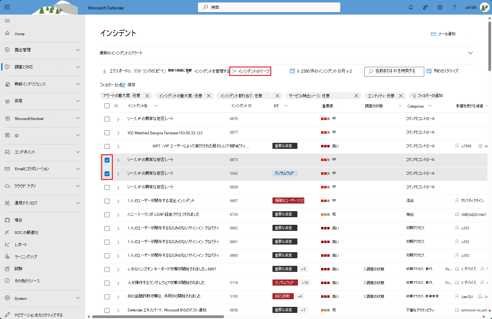 キュー内の行の先頭にあるチェック ボックスをオンにして、マージする 2 つのインシデントを選択します。 2 つのインシデントがマークされると、ツール バーに [ インシデントのマージ ] ボタンが表示されます。