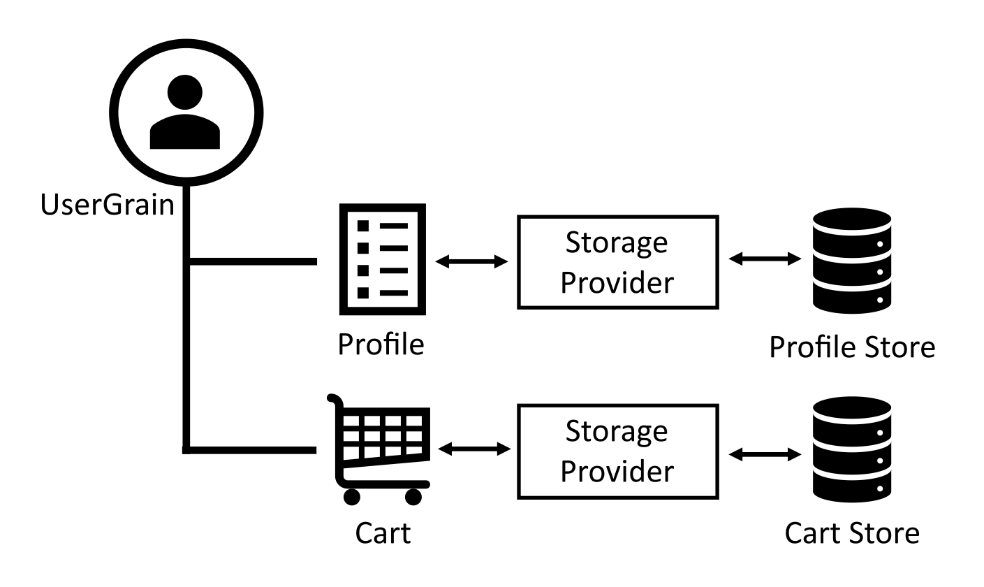 上の図では、UserGrain には プロファイル 状態と カート 状態があり、それぞれが個別のストレージ システムに格納されています。