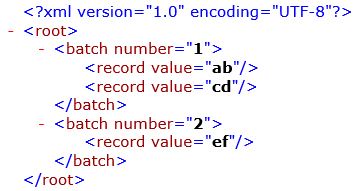 次の図は、設計された形式レイアウトを示します。 この形式のレイアウトでは、XML 形式で出力を生成するために作成される 明細行 データ ソースにバインディングされます。 この出力は、各バッチとその中のレコードに対する個々のノードを表示します。