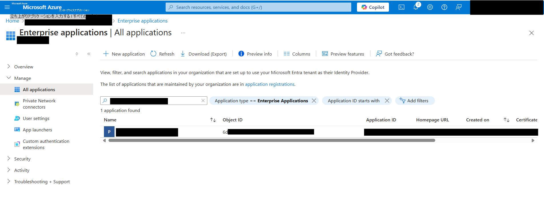 テナント管理者は、上記で参照されているサービス プリンシパル識別子を、テナント上の Entra アプリケーションのエンタープライズ アプリケーション インスタンスで見つけることができます。 テナントのエンタープライズ アプリケーション インスタンスの一覧は、Azure Portal の [Microsoft Entra] ビューの [エンタープライズ アプリケーション] ブレードにあります。