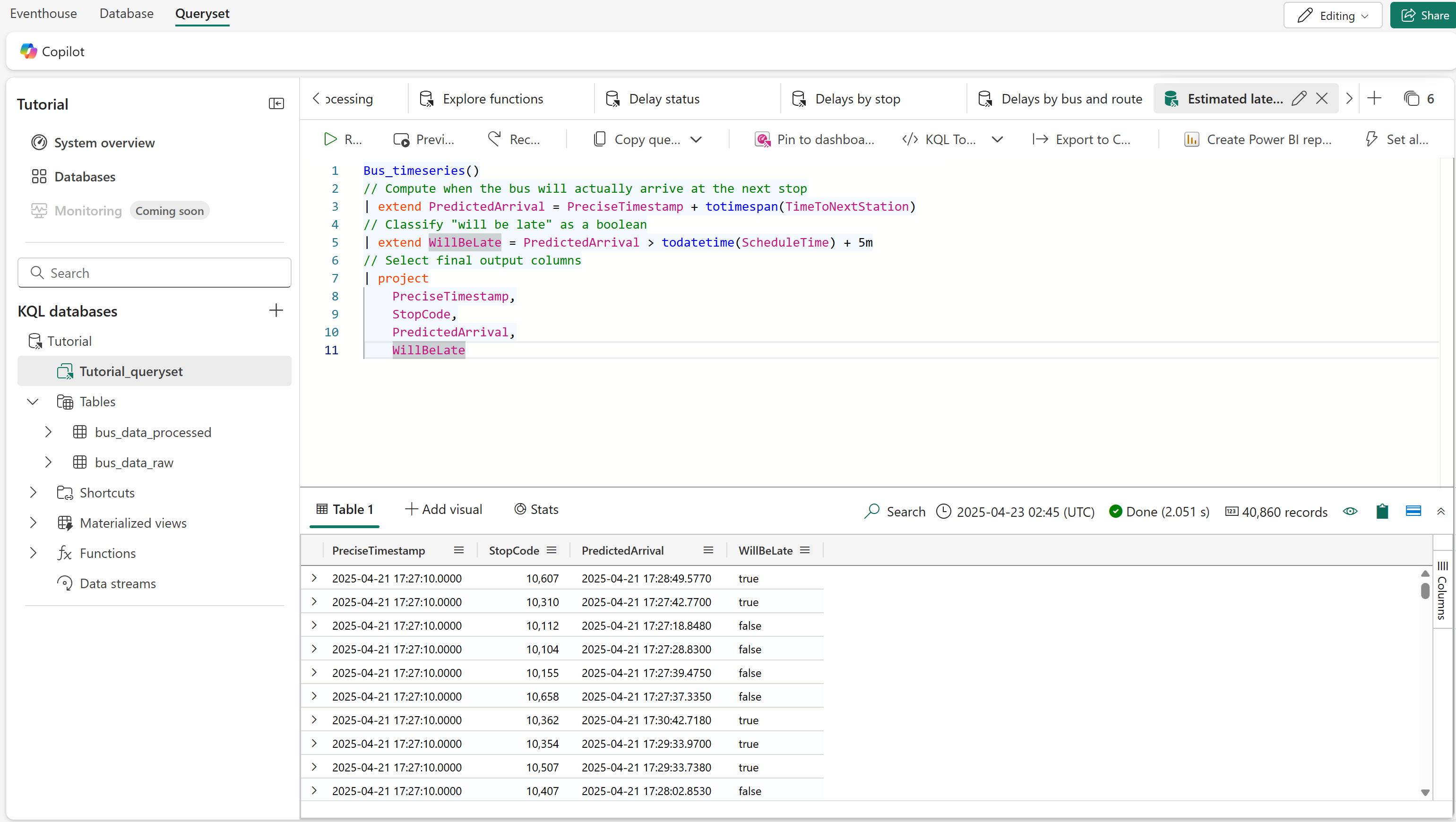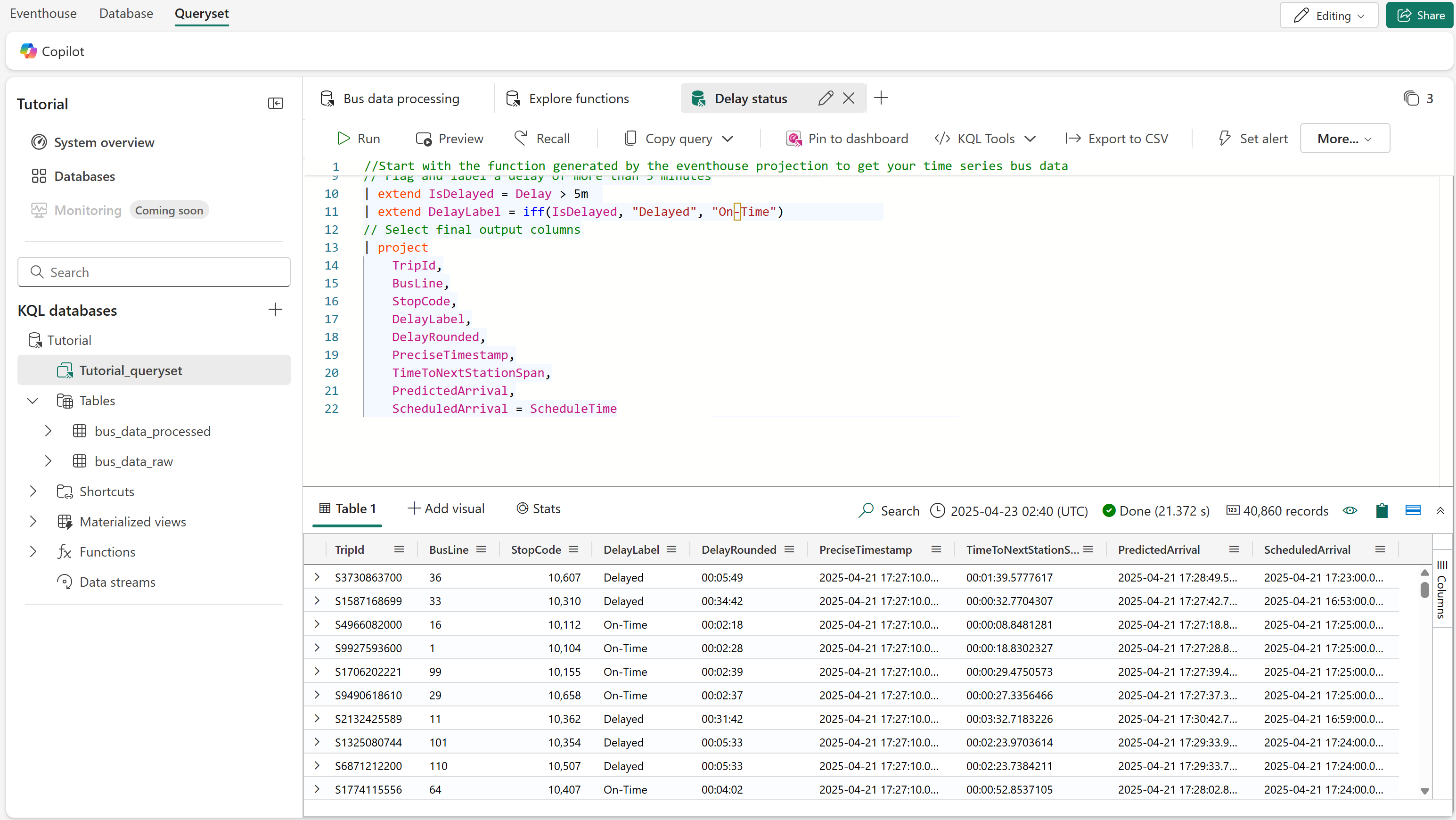 //Start with the function generated by the eventhouse projection to get your time series bus data