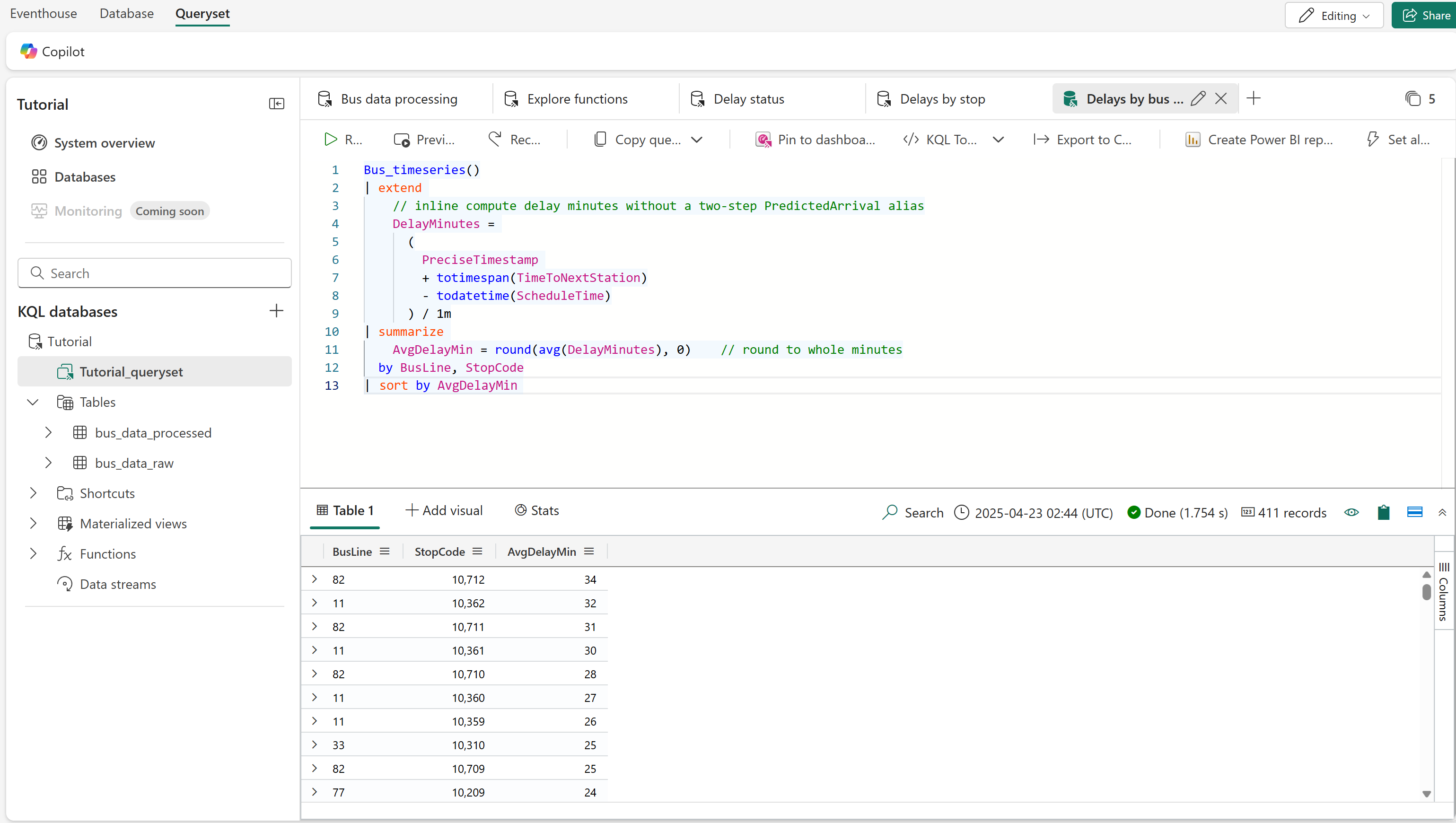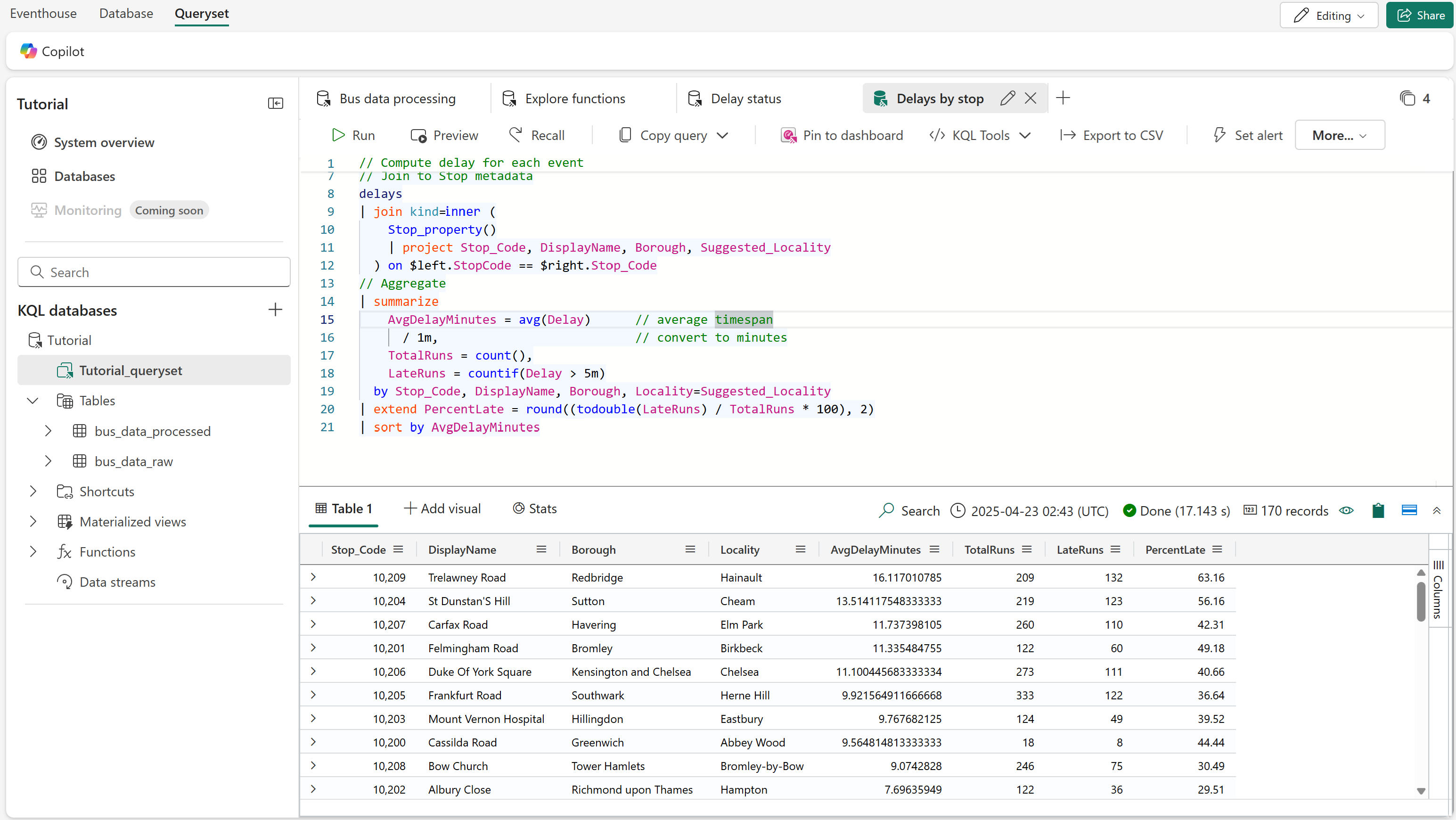 このクエリは、バス ルートの観点から遅延に関する情報を計算し、バスラインとストップ コードの組み合わせごとに平均遅延を計算します。
