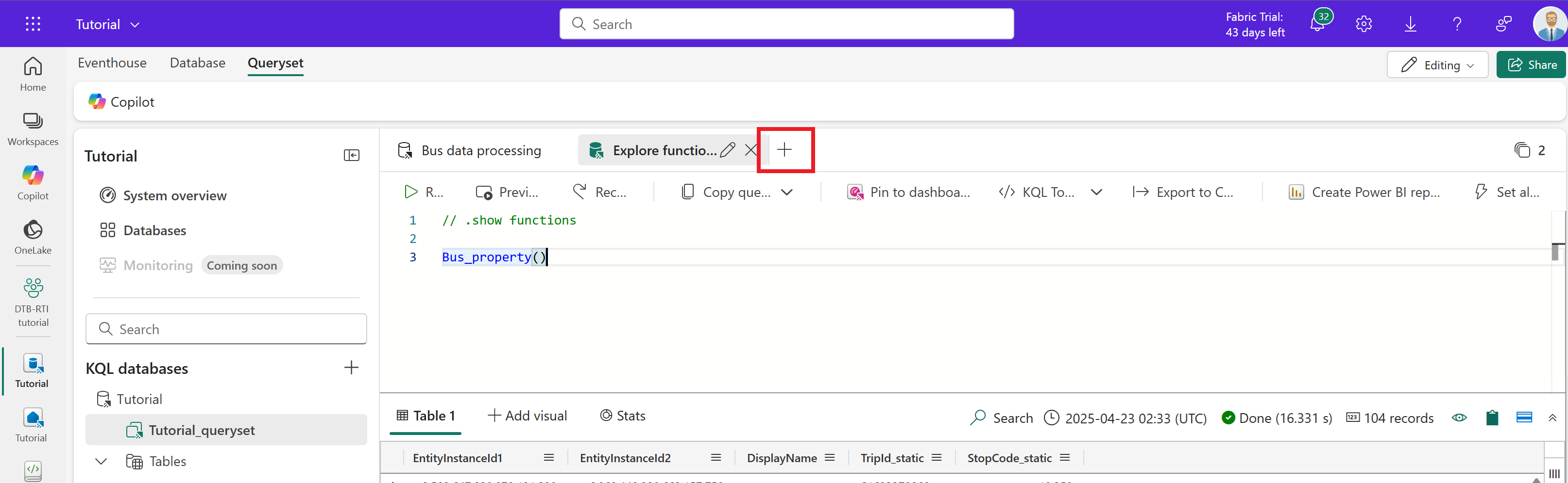 クエリ ウィンドウの上の + を使用して、次の新しいクエリを作成します。 (KQL クエリの作成の詳細については、 KQL クエリ セット内のデータのクエリを参照してください)。