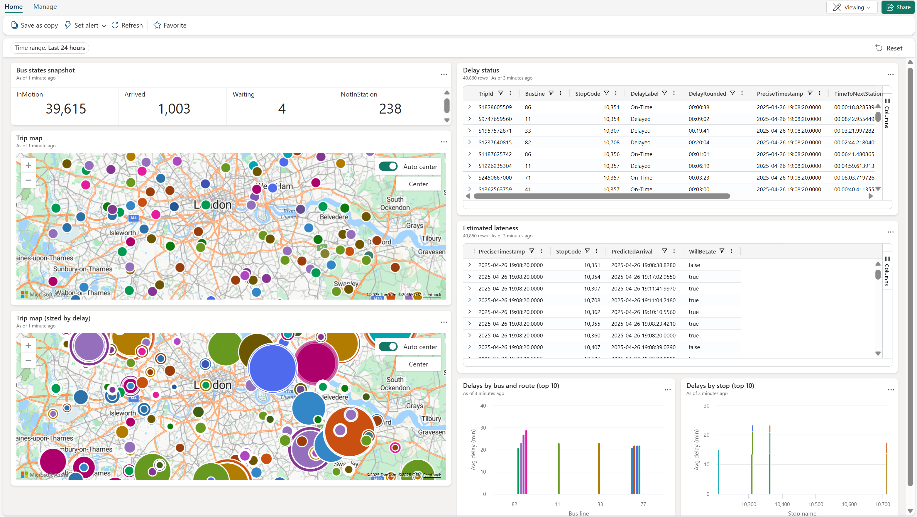 ダッシュボードの外観を次に示します (前のセクションのクエリに注目してください: 遅延状態、 停止による遅延、 バスとルートによる遅延、 推定遅延数)。