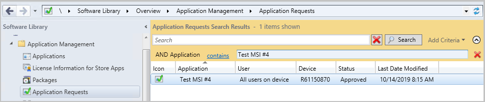 管理者は、ソフトウェア ライブラリ>Application Management>Approval Requests から、Configuration Manager コンソールに承認済みの要求を引き続き表示できます。