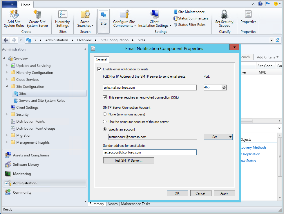 - 電子メール サンプルを送信することで、SMTP サーバーをテストできます。 [Email通知のプロパティ] ダイアログで [SMTP サーバーのテスト] を選択します。