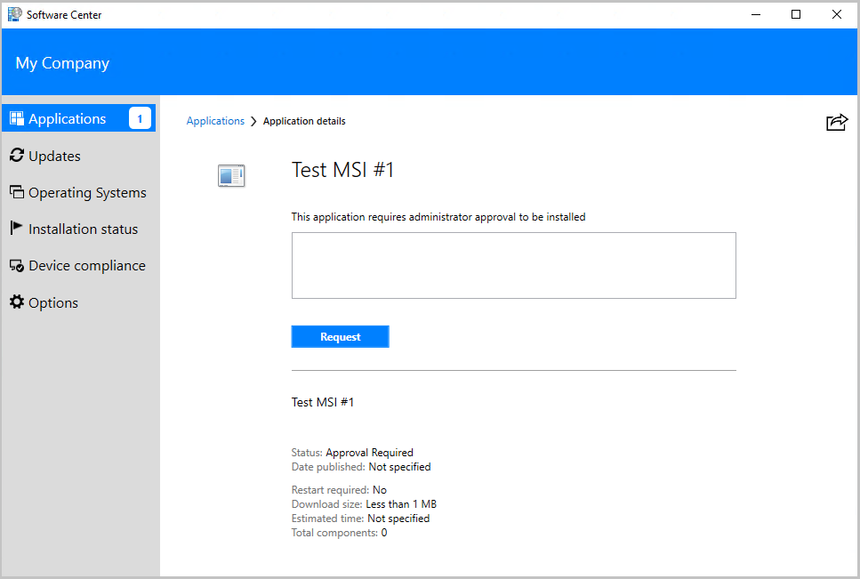 ユーザーはソフトウェア センターのアプリケーションの一覧を参照しますが、要求が承認されるまでアプリケーションをインストールできません。 ユーザーはソフトウェア センターから要求を送信し、要求の理由を指定します。 [ デバイスごとのユーザーに対するアプリケーション要求の承認] オプションが有効になっている場合、ユーザーはアプリケーションをインストールするすべてのデバイスから承認を要求する必要があります。 その後、管理者は、要求が行われたユーザーのデバイスごとに要求を承認または拒否します。