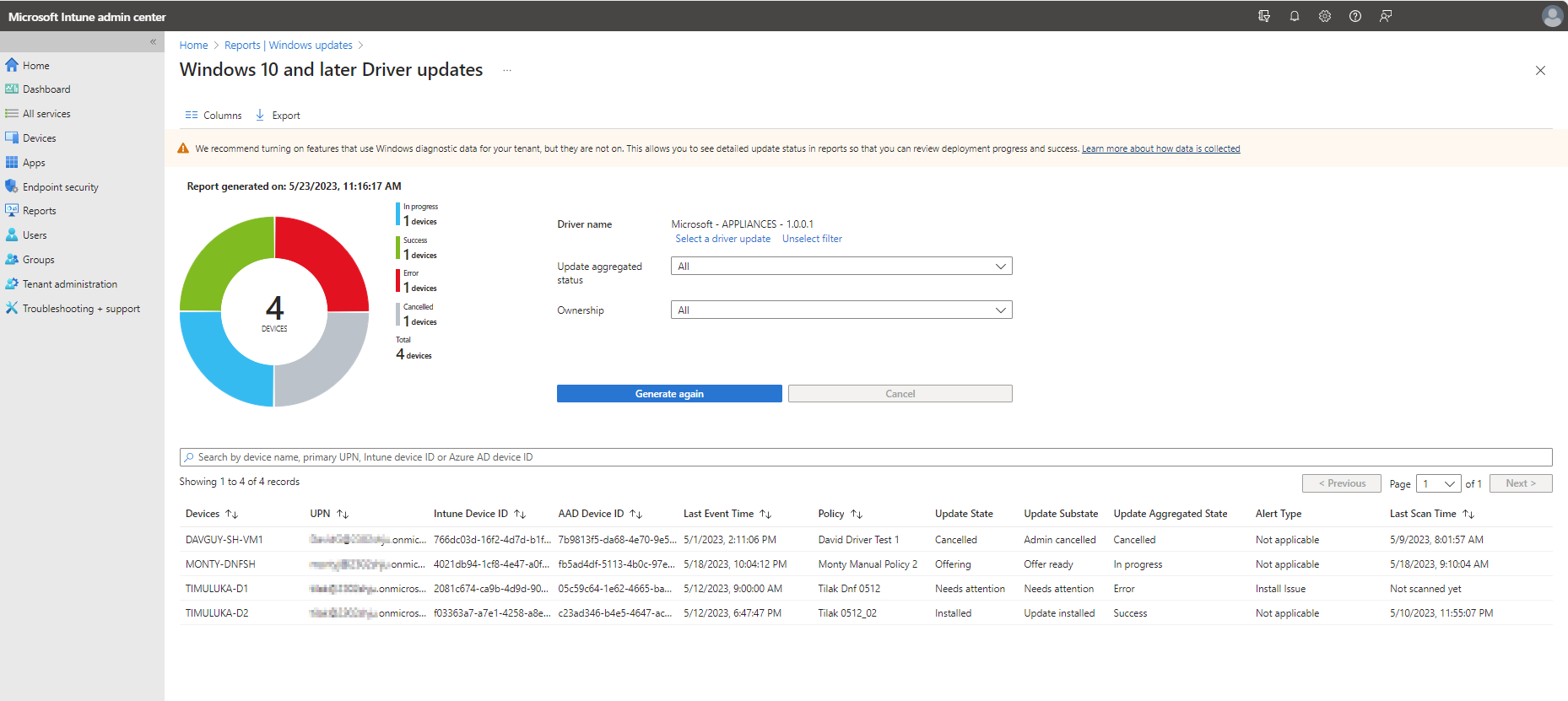 Windows ドライバー更新ポリシーのIntune レポートのデータは、これらのレポートにのみ使用され、他のIntune レポートには表示されません。 次の利用状況レポートを使用できます。