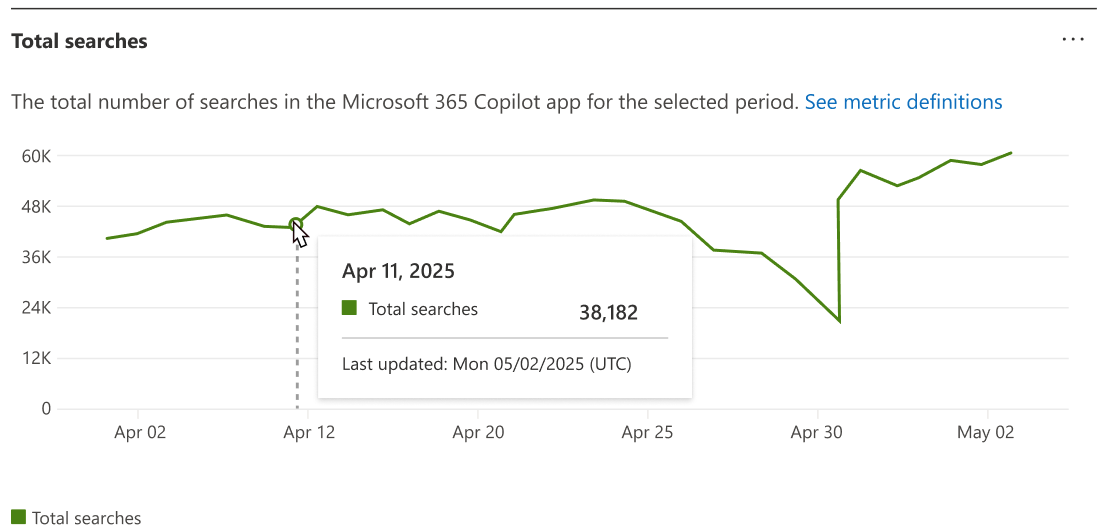 合計検索 では、選択した期間内にアクティブ ユーザーによる Copilot Search で行われた個別の検索クエリの数が、 アクティブユーザー 定義に要約された一連の動作と一致して表示されます。
