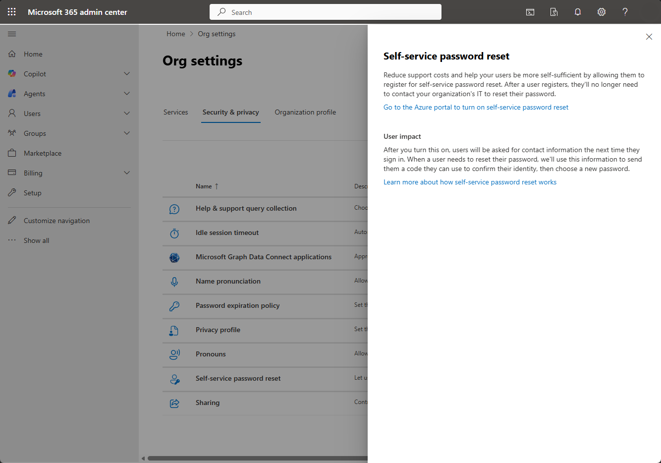 Microsoft 365 管理センターの左側のナビゲーション ウィンドウで、[設定]>、[Org の設定] の順に選択し、[セキュリティ & プライバシー] タブを選択します (または、このリンクを使用してそのタブを開きます:セキュリティ & プライバシー)。
