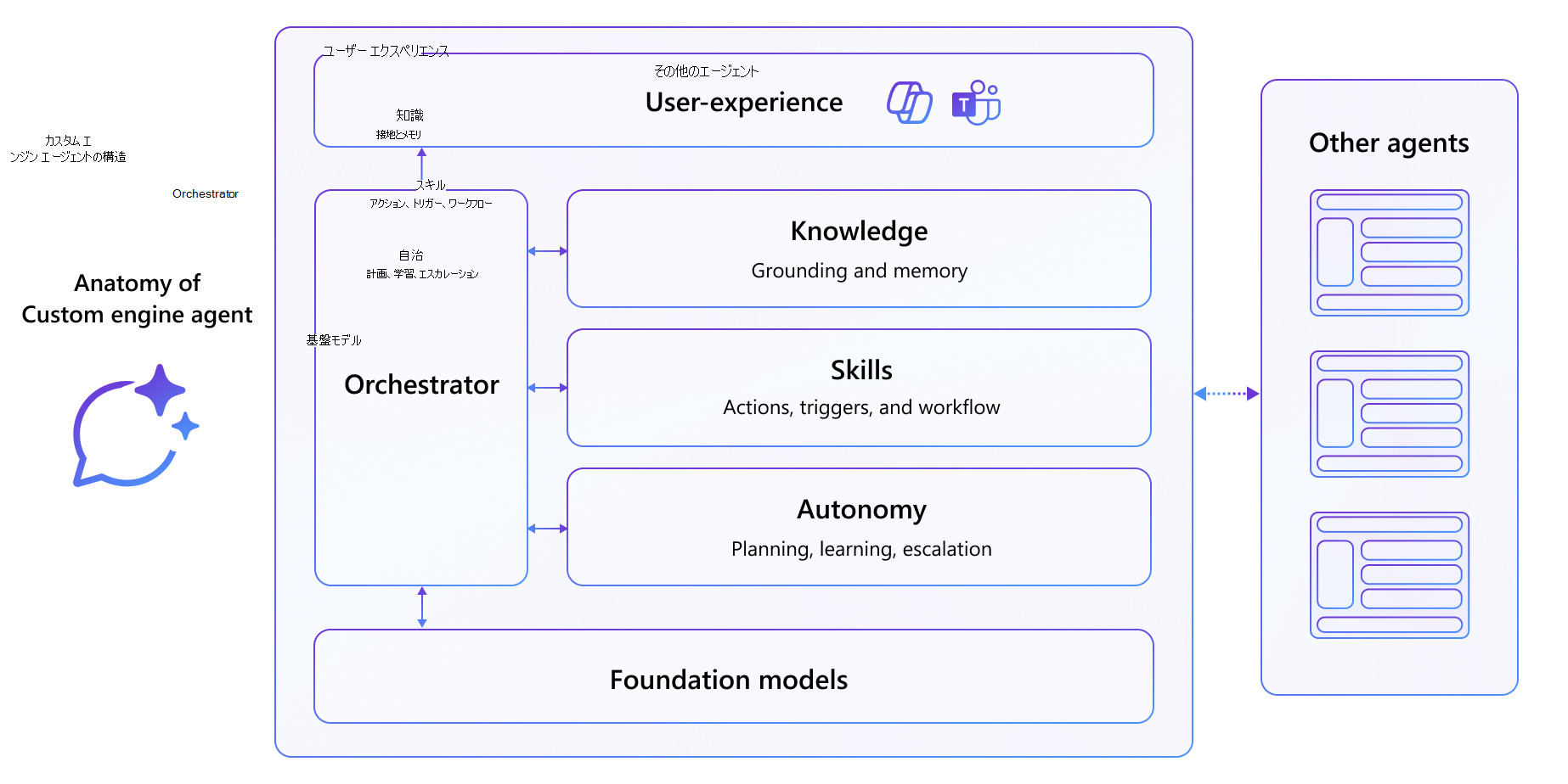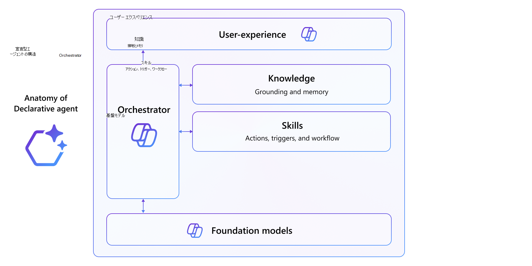 - オーケストレーターは、エージェントが知識、スキル、自律性と対話する方法を管理する中央エンジンとして機能します。