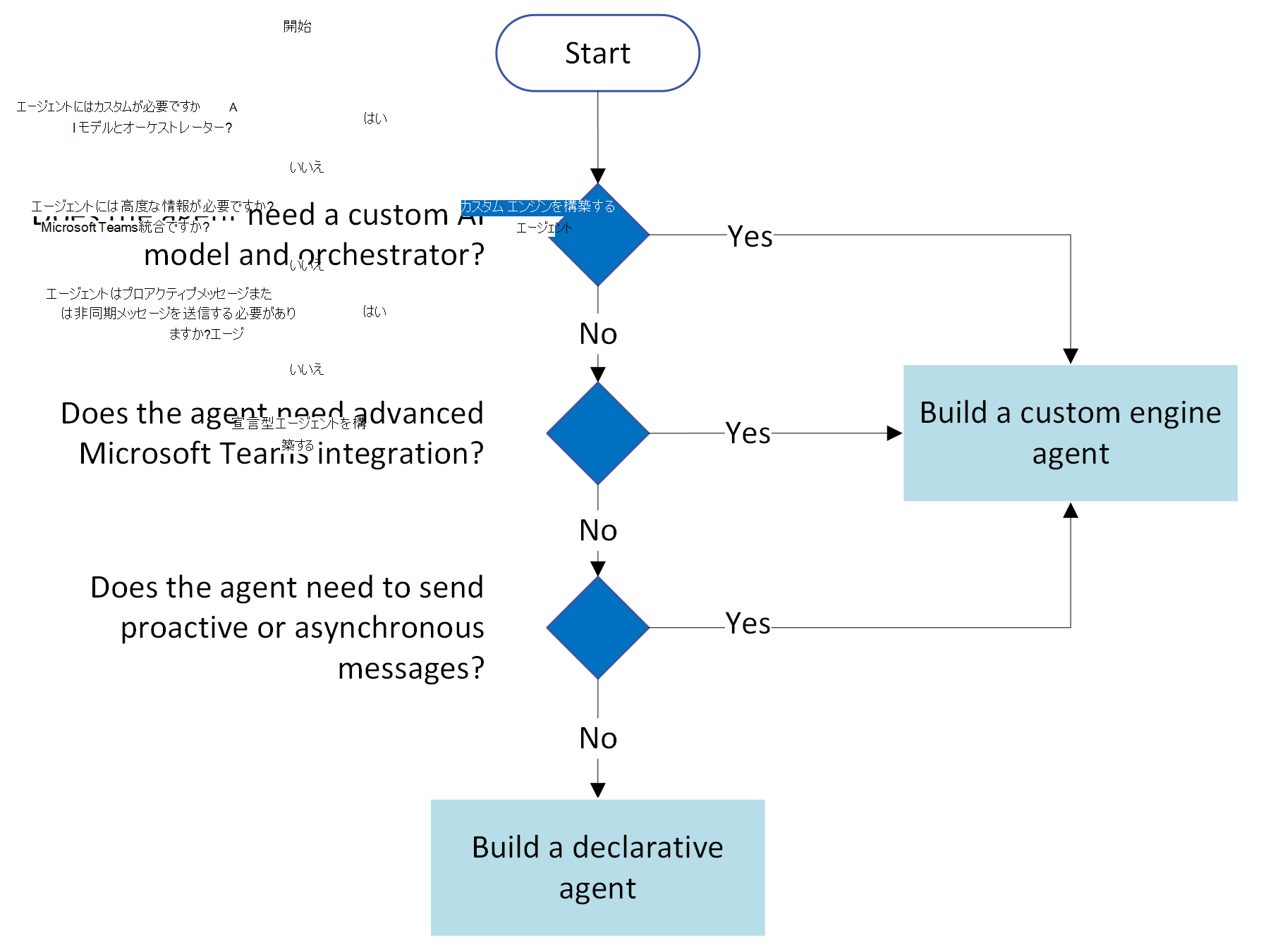 次のフローチャートは、構築するエージェントの種類を選択するための決定プロセスをまとめたものです。