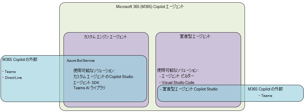 | エンジンホスティング | Microsoft 365 でホストされています。 | Copilot Studioまたは Azure AI などのカスタム ソリューションを使用して外部で Microsoft 365 でホストされます。 |