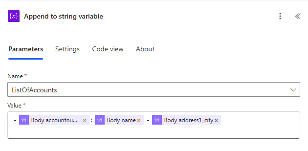 - @{items('Apply_to_each')['accountnumber']}: @{items('Apply_to_each')['name']} - @{items('Apply_to_each')['address1_city']}スニペットの後に改行を追加して、各結果がそれぞれの行に表示されるようにします。