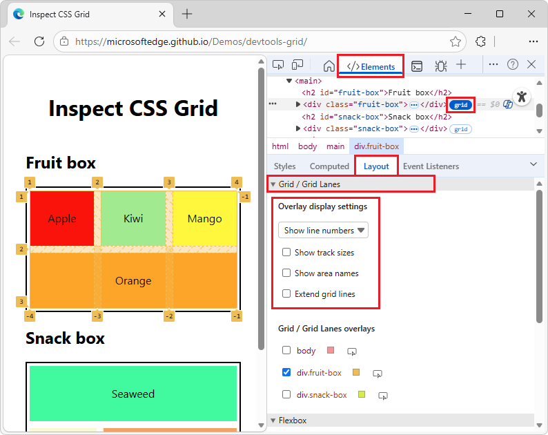 div.fruit-boxとdiv.snack-box] の横にあるチェック ボックスをオンにします。[Grid/Grid Lanes]\(グリッド/グリッド レーン\) セクション>[Overlay display settings]\(表示設定\) サブセクションで、[トラック サイズを表示する] チェック ボックスをオンにします。
