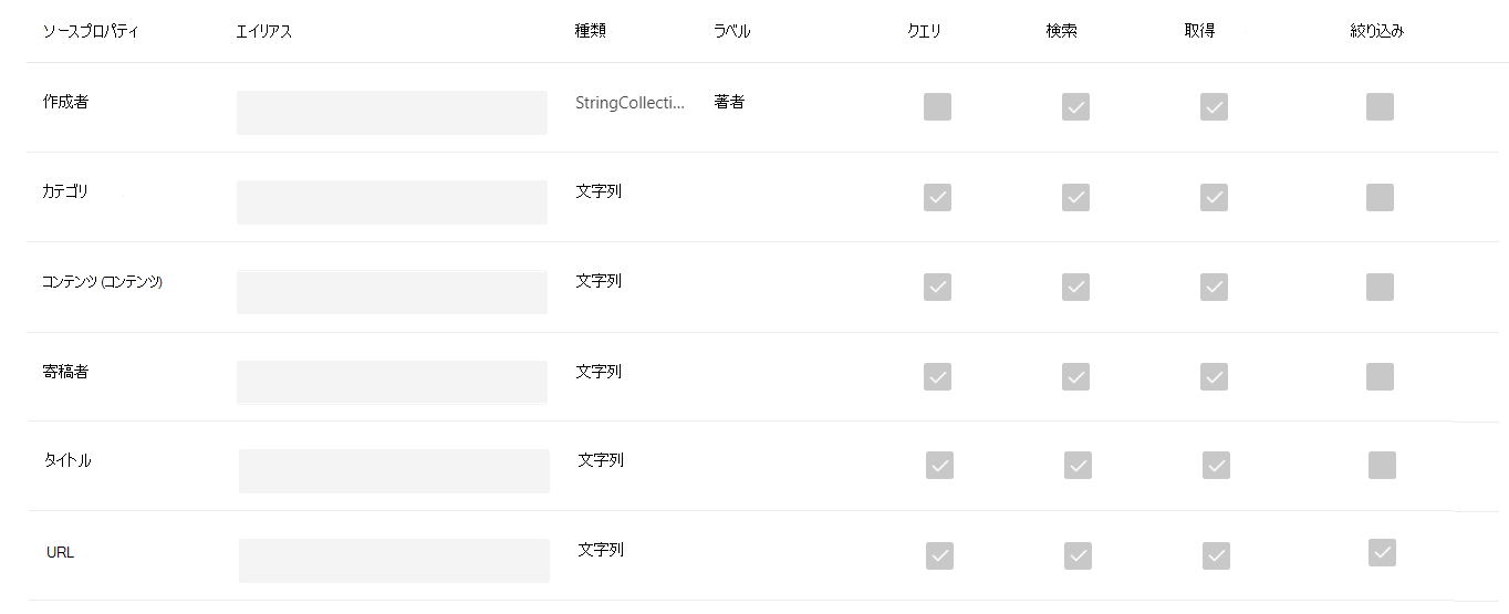 [エイリアス] 列の下のプロパティにエイリアスを追加できます。 エイリアスは、プロパティのフレンドリ名です。 クエリやフィルターの作成に使用されます。 また、複数の接続からのソース プロパティを正規化して、同じ名前になるようにするためにも使用されます。 こうすることで、複数の接続を持つバーティカル用に 1 つのフィルターを作成できます。 詳細については、「検索バーティカルの管理」をご覧ください。