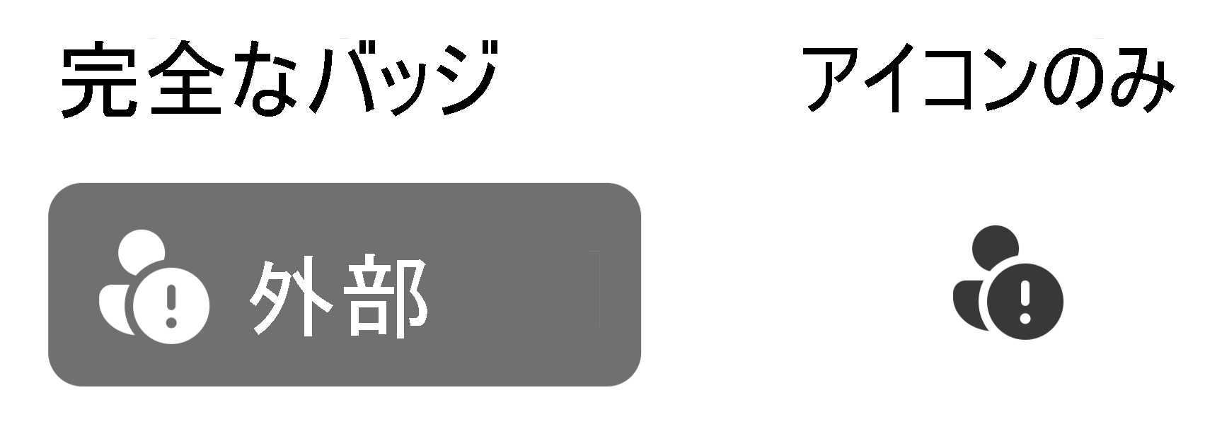 organizationの外部から他のユーザーとやり取りするたびに、名前の横に複数のトラスト インジケーター バッジまたはアイコンのいずれかが表示されます。 バッジのラベルはユーザーのカテゴリを示し、表示される正確なバッジは、そのユーザーが自分やorganizationにどのように関連しているかによって異なります。
