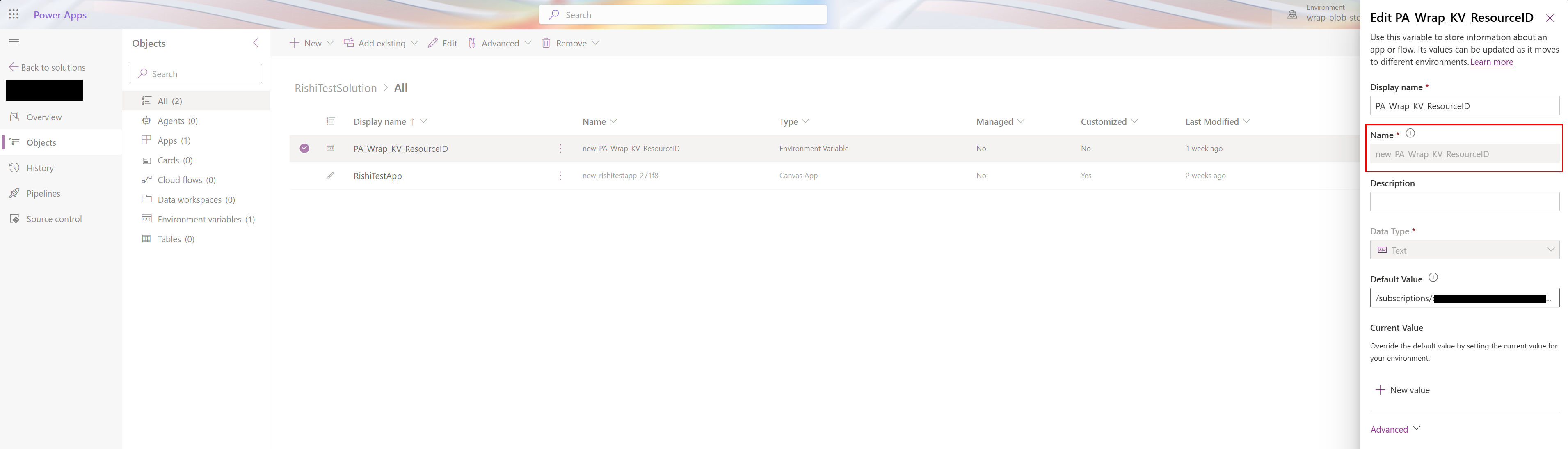 - テーブルの値が更新されたかどうかを確認するには、Power Apps>テーブル>環境変数の定義>new_PA_Wrap_KV_ResourceID に移動します。