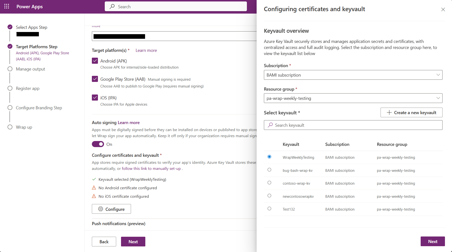 ターゲット プラットフォームの手順で、 自動署名を切り替えます。 サービスは、キー ボールトと証明書が既に接続されているかどうかを確認します。