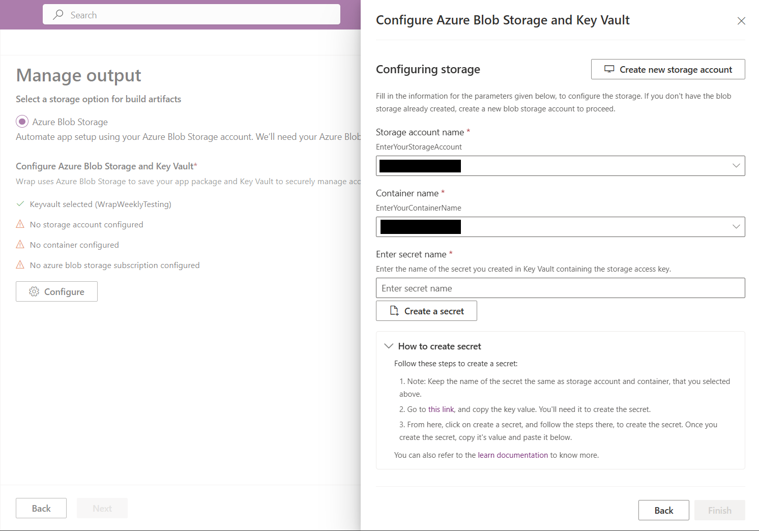 ビルドを Azure Blob Storage にアップロードするには、Azure Key Vault が必要です。 まだ作成していない場合は、作成してください。 ラップ ウィザード内で Azure キー コンテナーを作成するか、手動で手順に従います。