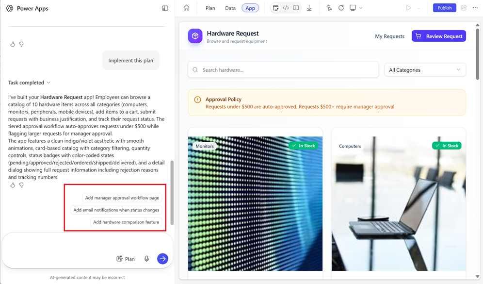 新しいワークスペースでは、 プラン、 データ、 アプリを切り替える際にコンテキストを保持する統合チャット エクスペリエンスが使用されます。 アプリを視覚的にプレビューし、コードを検査し、ワークスペースを離れることなく変更を加えることで、開発を高速化します。