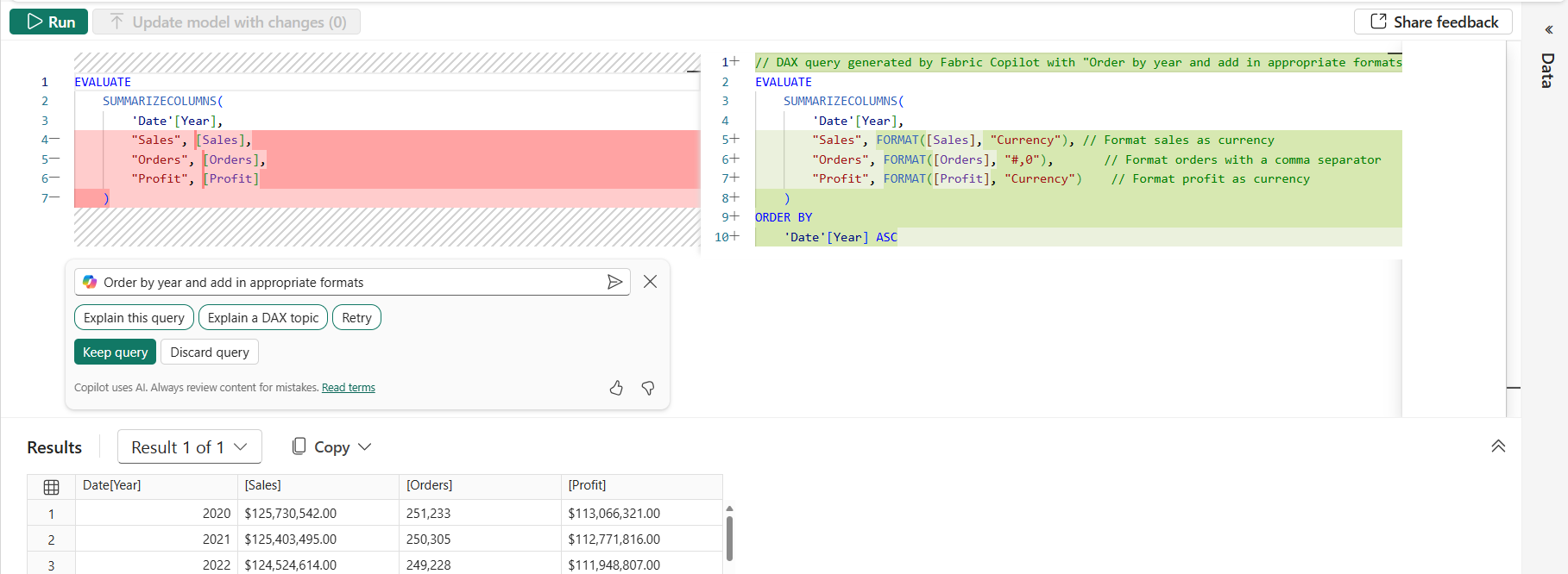 Copilot は、データ分析式 (DAX) クエリを記述できます。 たとえば、生成する DAX クエリを説明するプロンプトを入力し、[ 送信 ] を選択するか Enter キーを押します。 返された内容を実行するには、[ 保持 ] を選択してクエリ タブに追加します。次に、[ 実行 ] を選択するか 、F5 キーを押して DAX クエリの結果を表示します。 詳しくは、「DAX クエリを記述する」の記事の中を読んでください。