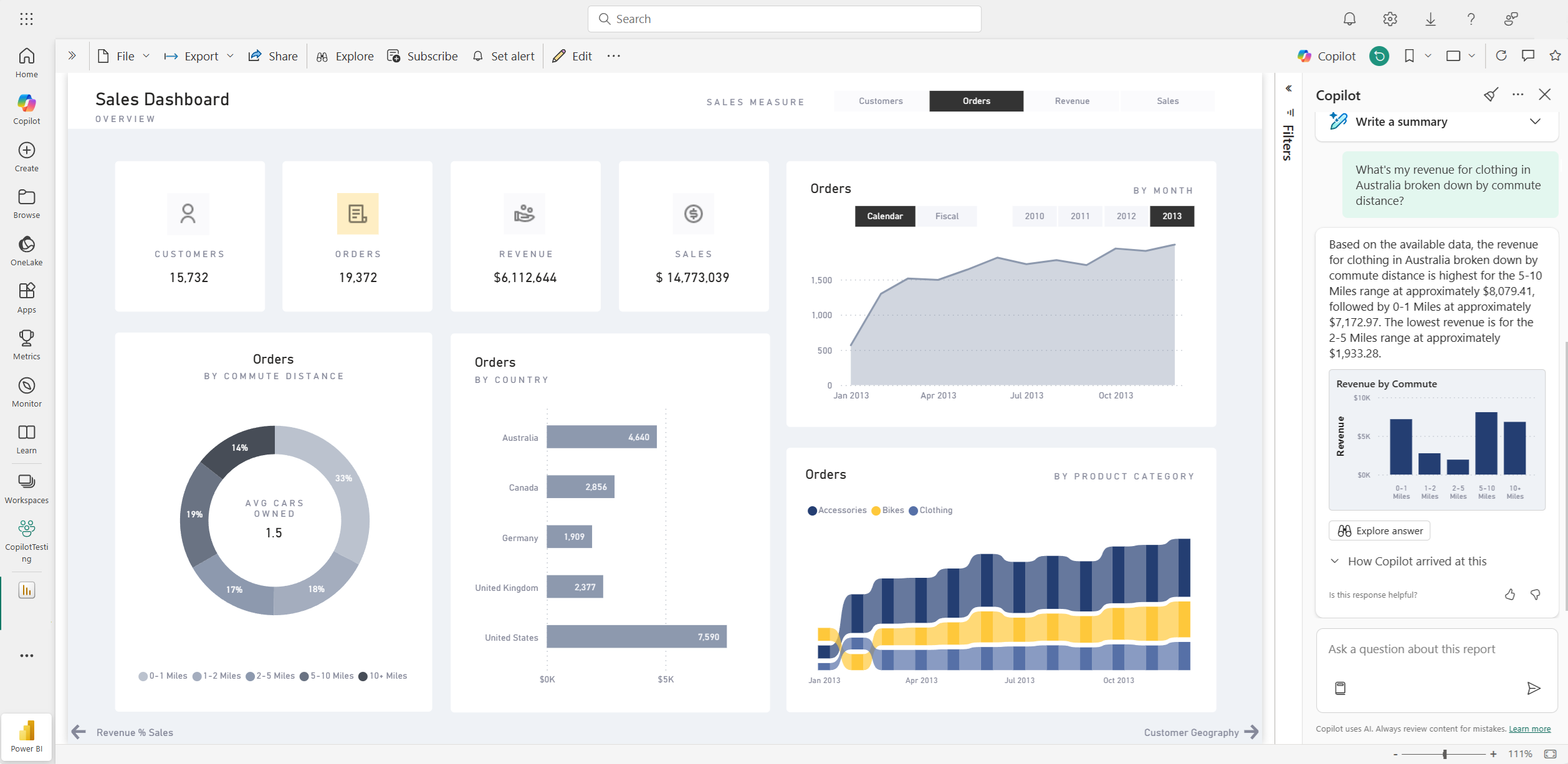 Copilot では、セマンティック モデルのメジャーと列を使用して、データを新しい方法で探索することができます。 レポートとモデルに関する質問をすると、Copilot はレポートビジュアルで回答が見つかるかどうかを確認します。 既存のビジュアルが質問に答えない場合、Copilot はモデルを使用してビジュアルを作成します。