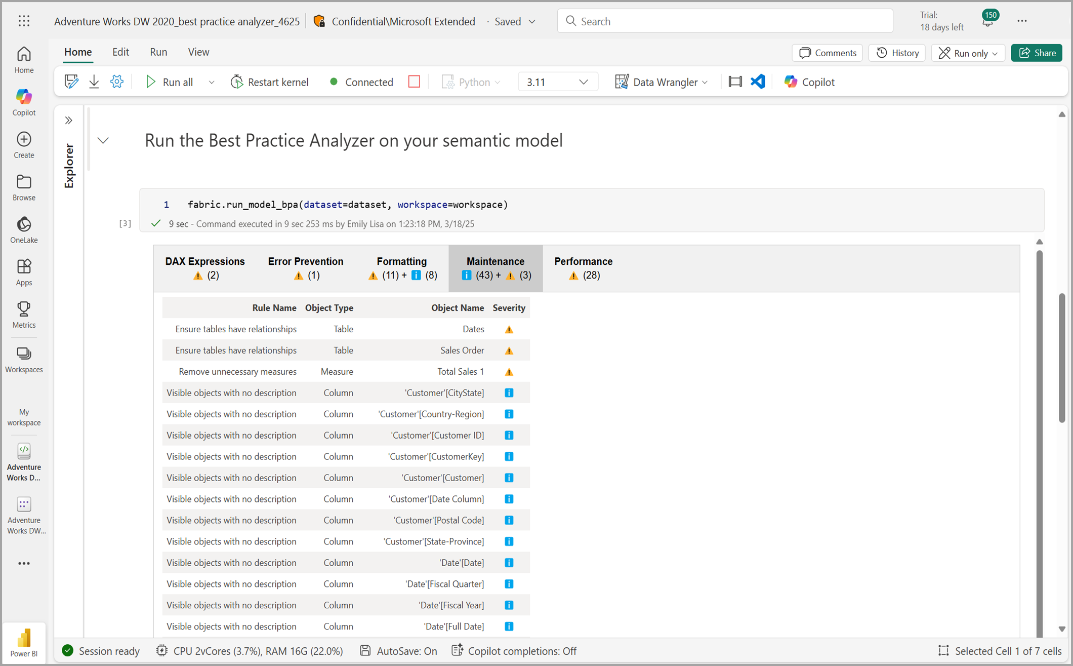 サンプル ノートブックを実行すると、 ベスト プラクティス アナライザー (BPA) には、セマンティック モデルの設計とパフォーマンスを向上させるためのヒントが用意されています。 既定では、BPA はセマンティック モデルに対して 60 を超えるルールのセットをチェックし、結果を要約します。 BPA で使用される規則は、Microsoft および Fabric Community 内の専門家によって提供されます。 改善の提案は、パフォーマンス、DAX 式、エラー防止、メンテナンス、書式設定の 5 つのカテゴリに分類されます。