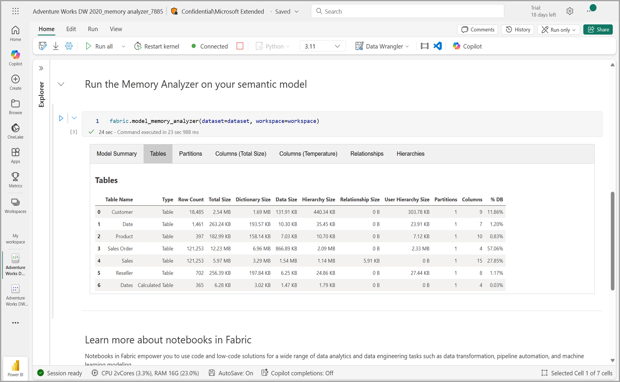 サンプル ノートブック ノートブックを実行すると、 Memory Analyzer によって、セマンティック モデル内のオブジェクト (テーブル、列、階層、パーティション、リレーションシップなど) に関するメモリとストレージの統計情報が表示されます。 Memory Analyzer から返される統計を使用して、セマンティック モデルのパフォーマンス最適化とメモリ削減の領域を特定できます。 次の図は、使用中の Memory Analyzer を示しています。