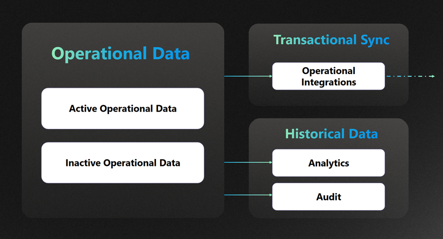 次の図に示すように、これらのタイプのデータは通常、時間の経過とともに運用データからトランザクション データまたは履歴データに流れます。