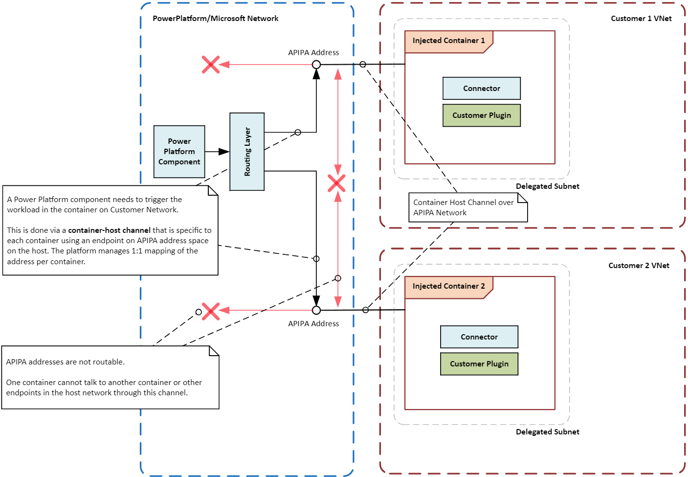 コンテナー化されたワークロードにより、Power Platform では、Azureサブネット委任とVirtual Networkインジェクション機能の組み合わせを使用して、ネットワーク レベルの分離をサポートできます。 Virtual Networkインジェクションでは、ネットワーク インターフェイス カードを接続することで、コンテナーをvirtual networkに挿入できます。 そのコンテナで実行されているワークロードは、お客様のネットワークで実行され、ネットワーク内のプライベートIPアドレスを使用できます。 プラグイン ワークロードは、同じ仮想ネットワークに公開されているプライベート リンクを使用して、ユーザー サービス、リソース、またはAzure リソースにアクセスできます。 同様に、コネクタ ワークロードは、同じ仮想ネットワーク内のターゲット リソースまたはエンドポイントにアクセスできます。