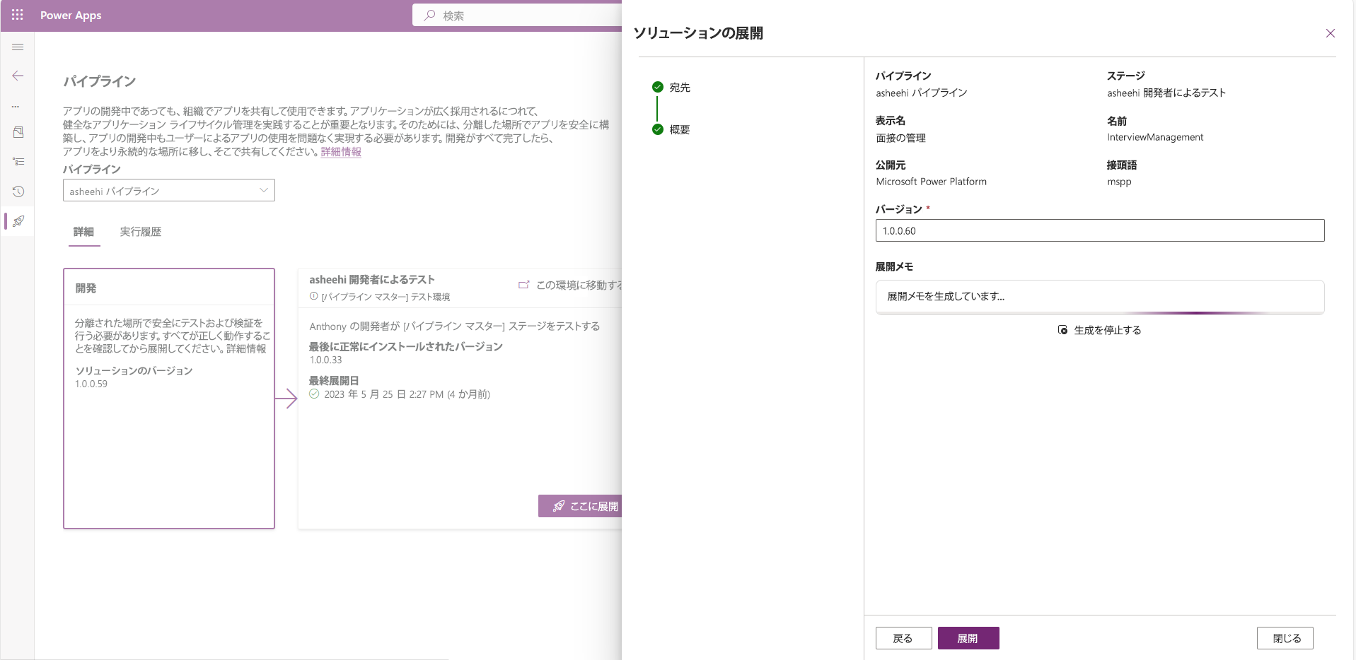 Power Platform のパイプラインにソリューションを展開する場合、メモを使用して展開 することができます。