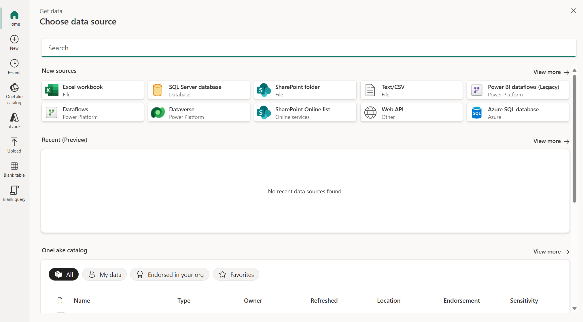 ホーム ページは、すべてのモジュールの概要として機能し、プロセスを迅速化してデータに近づけるためのさまざまなオプションを提供します。 通常、このモジュールには既存のデータ ソースが含まれており、新しいデータ ソース、テーブル、およびアップロード ファイルを使用するオプションが提供されます。 ホーム ページから、[新しいソース]、[最近使用した (プレビュー)]、および OneLake カタログ セクションの右側にある [詳細を表示] を選択して、これらのモジュールにアクセスできます。
