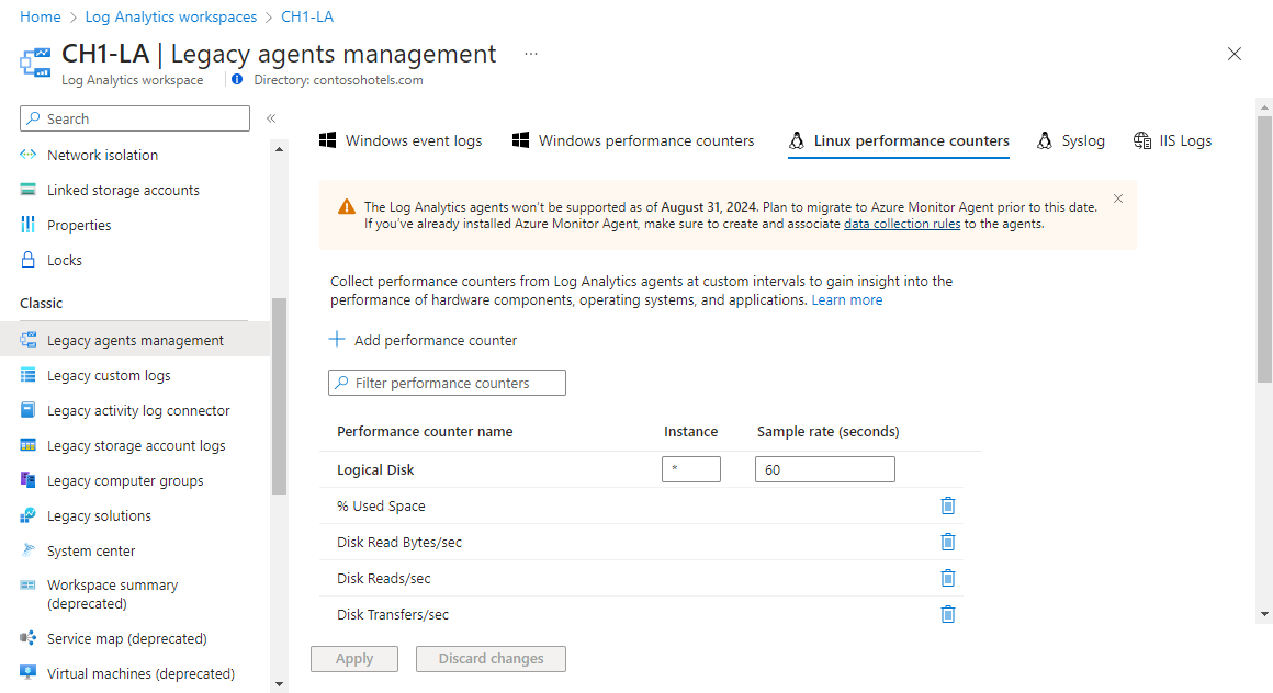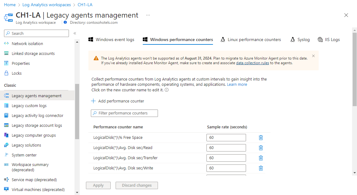 Log Analytics ワークスペースの レガシ エージェント管理メニュー からパフォーマンス カウンターを構成します。