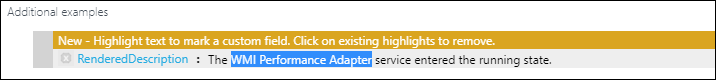- エントリは、Main Example の下の [Additional examples]\(追加の例\) セクションにコピーされます。 ここで強調表示を調整して、Log Analytics が行う必要がある選択内容を理解するのに役立ちます。