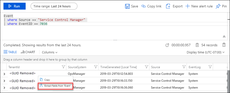 次に、イベント ID 7036 のレコードを右クリックし、[イベント] から [フィールドの抽出] を選択します。