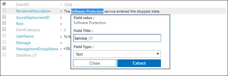 次のセクションでは、ユーザー設定フィールドを作成する完全な例について説明します。 次の使用例は、サービスの状態の変化を示す Windows イベントでサービス名を抽出します。 これは、Windows コンピューターでのシステムの起動時に Service Control Manager によって作成されたイベントに依存します。 この例に従う場合は、 システム ログの情報イベントを収集する必要があります。