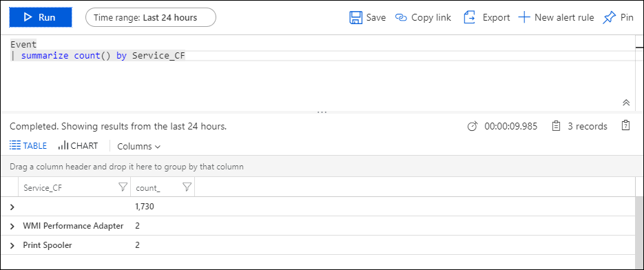 他のレコード プロパティと同様に、ユーザー設定フィールドを使用できるようになりました。 これを説明するために、新しい Service_CF フィールドごとにグループ化して、最もアクティブなサービスを検査するクエリを作成します。