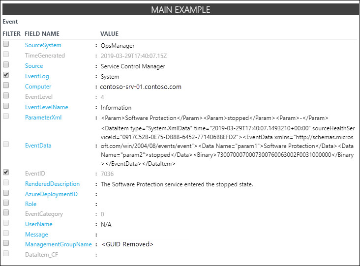 フィールド抽出ウィザードが開き、[メインの例] 列で EventLog フィールドと EventID フィールドが選択されます。 これは、イベント ID が 7036 のシステム ログからのイベントに対してユーザー設定フィールドが定義されることを示します。 これで十分なので、他のフィールドを選択する必要はありません。