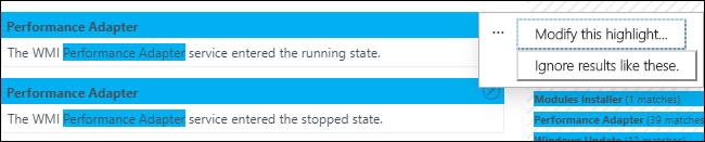 一部のレコードではサービス名が正しく識別されますが、他のレコードでは識別されません。 検索結果には、WMI パフォーマンス アダプターの名前の一部が選択されなかったことが示されます。 概要には、Windows モジュール インストーラーの代わりにモジュール インストーラーが識別されたレコードが 1 つ示されています。