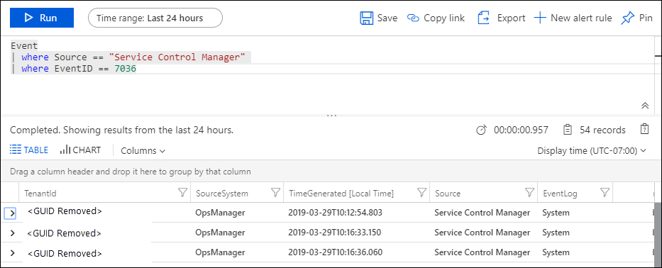 次のクエリを入力して、サービスの開始または停止を示すイベントであるイベント ID が 7036 の Service Control Manager からすべてのイベントを返します。