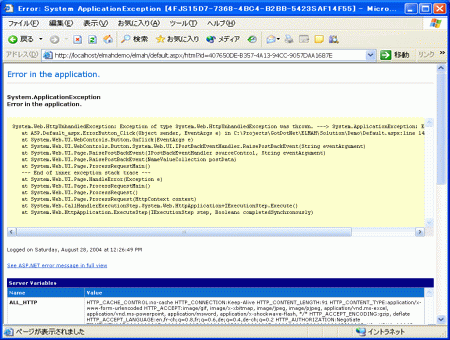 注: Error クラスは ServerVariables、QueryString、Form、Cookie の各コレクションを保存しますが、ServerVariables コレクションだけが例外の詳細に表示されます。これは、QueryString のパラメータと Cookie が、ServerVariable の QUERY_STRING パラメータと HTTP_COOKIE パラメータのそれぞれを通じて表示できるためです。Form コレクションは、通常は大部分の診断では役に立たない数十 KB のビュー状態の情報しか含まれていない可能性があるため省略されます。もちろん、必要に応じて、HTTP ハンドラの詳細を変更してこの情報を含めることは簡単です。