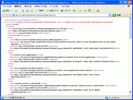 ASP.NET Web アプリケーションの設定では、HTTP ハンドラ ファクトリ ErrorLogPageFactory にマッピングするパス (ErrorLog.aspx など) を指定する必要があります。例外ログの RSS フィードを表示するには、http://www.example.com/ErrorLog.aspx/rss を参照します。