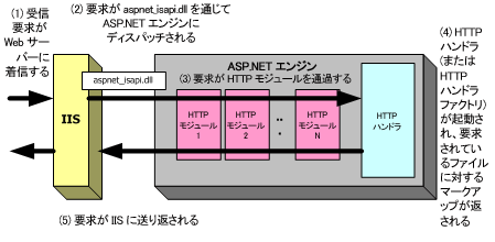 ASP.NET リソースへの要求が IIS に着信すると、その要求は ASP.NET エンジンにルーティングされます。要求されたリソースのコンテンツはこのエンジンでレンダリングされます。ASP.NET エンジンは IIS と似たような機能を行います。つまり、要求が ASP.NET HTTP パイプラインを通過する間にいくつかのイベントを発生させます。また、ASP.NET エンジンは、要求されたリソースのレンダリングを特定のクラスに委任します。IIS ではアンマネージ ISAPI 拡張機能と ISAPI フィルタを使用しますが、ASP.NET では HTTP ハンドラと HTTP モジュールというマネージ クラスを使用します。