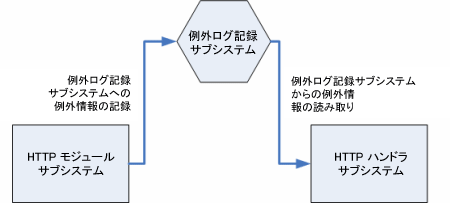 図 5 に示すように、HTTP モジュールと HTTP ハンドラのサブシステムは、どちらもエラー ログ記録サブシステムを利用します。HTTP モジュール サブシステムは、例外情報をエラー ログ記録サブシステムに送信します。その一方で、HTTP ハンドラ サブシステムは、そのエラー情報を読み取ってレンダリングします。
