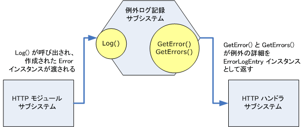 エラー ログ記録サブシステムは、エラーをログに記録するタスクとエラー情報をログから取得するタスクの 2 つを行います。HTTP モジュール サブシステムは、未処理の例外が ASP.NET アプリケーションで発生したときに、エラーをログに記録します。HTTP ハンドラ サブシステムは、エラー ログをマークアップにレンダリングする手段を提供し、エラー ログへの Web ベースのインターフェイスと RSS フィードで構成されています。